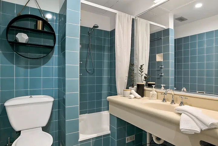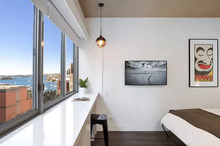 This modern studio apartment in Australia may not wow you at first, but you'll soon appreciate the relaxed and spacious apartment. Plus, check out the pretty tiled bathroom (next picture) and gorgeous view!