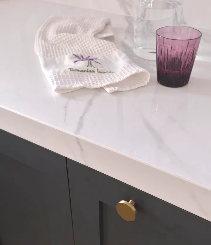 Introducing a subtle splash of colour is done with finishes, for example, gold or brass taps, handles, and door and cabinet knobs.