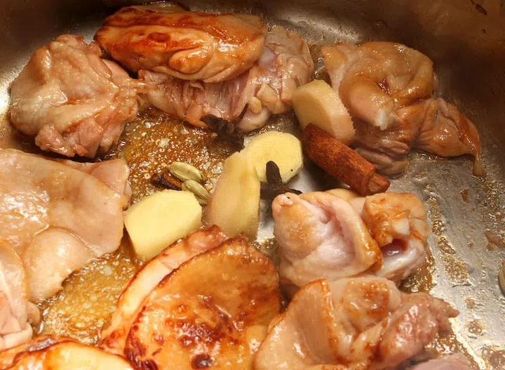 6. Once the sugar caramelises, add the chicken pieces to brown.