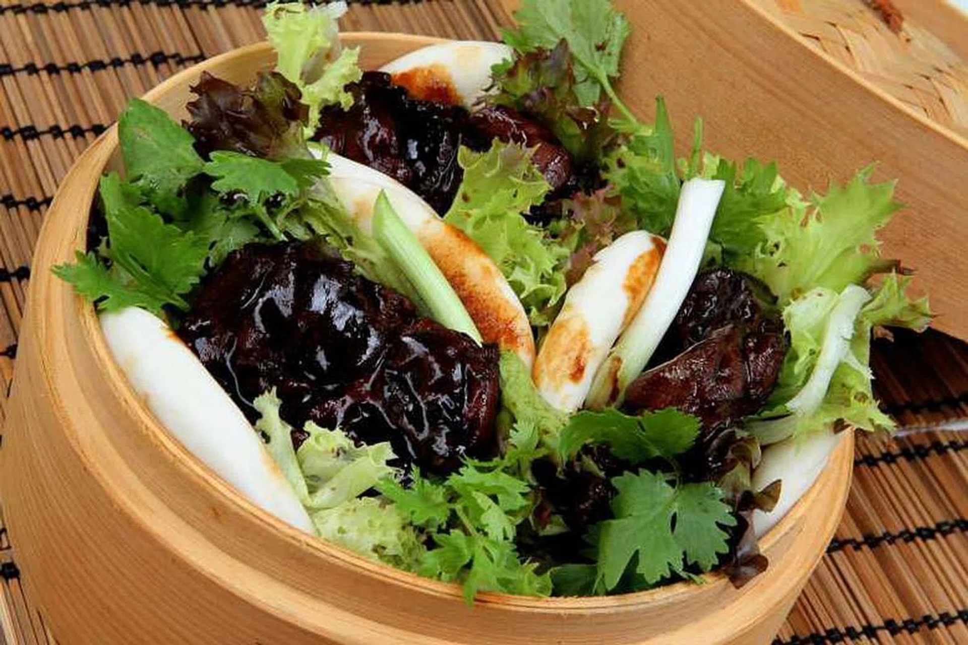 15. Assemble the buns by putting one piece of chicken, frisee leaves, fresh coriander and spring onion in each bun. Drizzle reserved gravy over the stuffed buns.