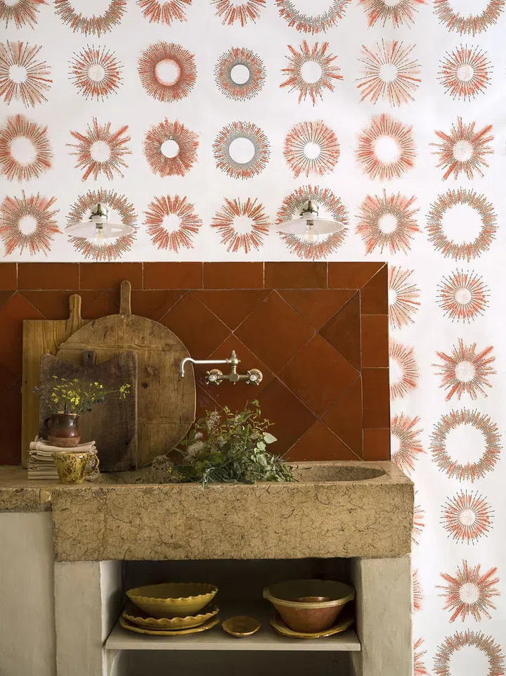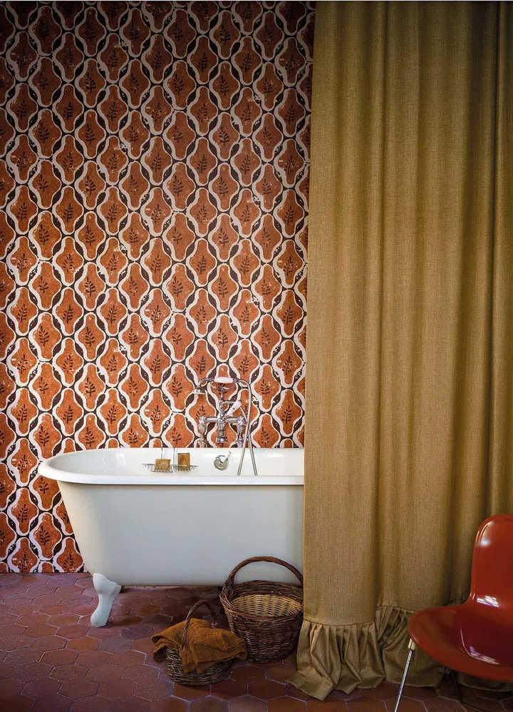 “It could also work in a bathroom setting as long as the space is large enough and has sufficient light.” Case in point is this setting with Pierre Frey’s new wallpaper Eternel Ete Luberon. A tribute to Provence, it is a contemporary take on the region’s 1950s ceramic motifs that pair terracotta with greys and white, and mix traditional and digital printing techniques for a handcrafted, wabi-sabi effect.