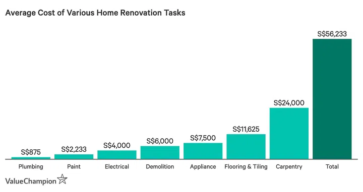 However, our research suggests that many will end up paying more than this amount. We estimate that the average renovation project costs about S$56,000, and that's before you take into account the cost of a renovation loan. Renovation loans vary in cost, but even the most affordable options will set you back about S$300 - S$1,000, depending on the loan duration.