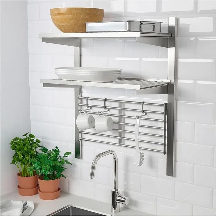 A shelf system like Ikea's Kungsfors suspension rail with shelf (pictured) is handy for keeping oft-used items within reach, while freeing up countertop space.
