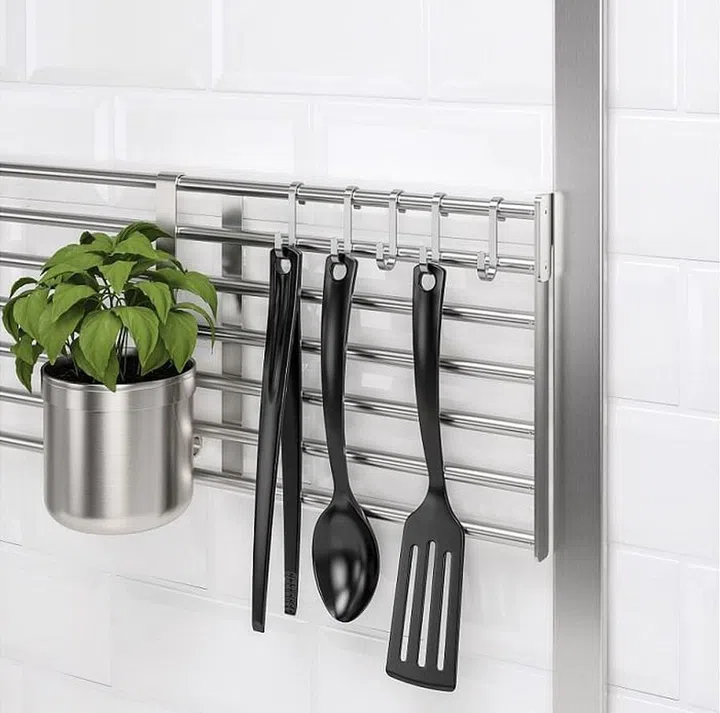 A grid system like this stainless steel Kungsfors wall grid from Ikea (pictured) is both versatile and functional. You can add as many hooks and containers as you wih to hang utensils and even an herb like basil.