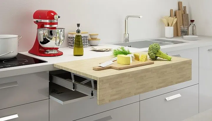 Another practical way to add space in your kitchen is with transformable pieces such as a table extension. The Ewins Atim Opla-Top (pictured) can be used as extra food prep surface, such as for chopping food.