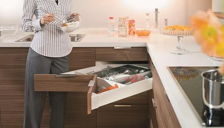 If changing the cabinet door to drawers is too troublesome, director of The 80's Studio, Andy Tan, suggests installing pullout organisers or baskets that help you reach items at the back with ease. The next125 Le Mans corner base unit from W. Atelier (pictured) features two pull-out shelves that swivel smoothly and quietly out, letting you stow away and retrieve items easily.
