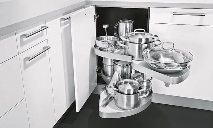 Cabinet corners tend to be wasted or not used optimally, because things are usually hard to retrieve. Try something like Blum's Space Corner (pictured), a nifty drawer system specially designed for corners so no square inch is dead space.
