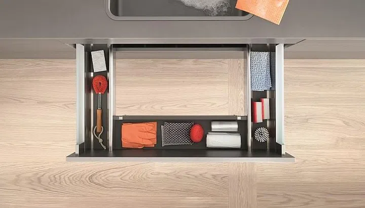 Cleaning products and other small kitchen accessories can create unnecessary cluter. Keep your sink area tidy and your cleaning products at hand with this nifty U-shaped sink drawer from Blum (pictured).