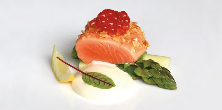 ■ Place asparagus on plate, and top with fish fillet, hollandaise espuma, and almonds. Garnish with ikura.