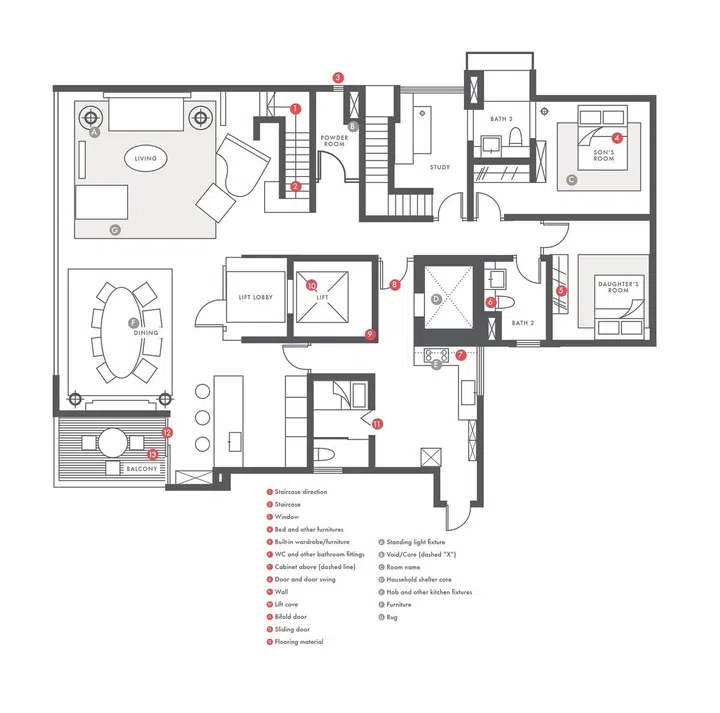 The floor plan is generated by horizontally cutting through vertical elements approximately 1.2m above ground level. Besides showing the building or home envelope, internal layout, walls, doors and windows demarcating the rooms, the names of rooms and the location of staircases and lifts, it also indicates the interior features, furniture, fixtures, and even flooring materials.
