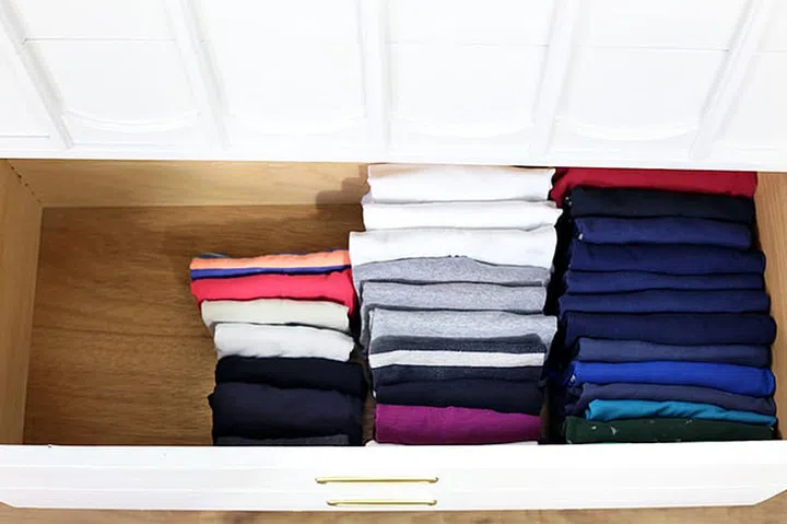 Tradition calls for clothes to be stacked one on top of each other, but storing them in a vertical fashion (no pun intended) saves space and makes it so much easier to find the piece you want. (It's also called the Kon Mari method, in case you're wondering.)