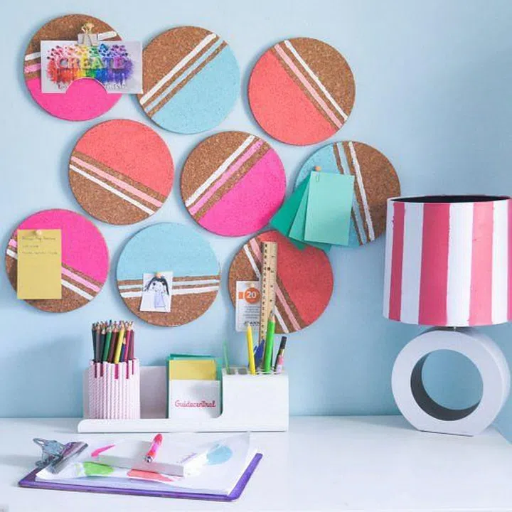 Instead of using standard framed rectangular cork pinboards in your study (or anywhere), buy round cork trivets from the supermarket. They're inexpensive and you can stick them on the wall with double-sided tape anywhere you please.