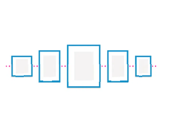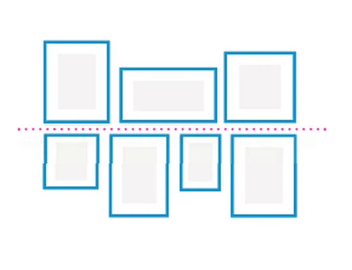 Or more accurately; along an edge. All of the pictures are aligned along a horizontal line. The ones on top are aligned along the lower edge of their frames, the ones on the bottom along the top of their frames. For best results, keep the distance between the pictures equal.