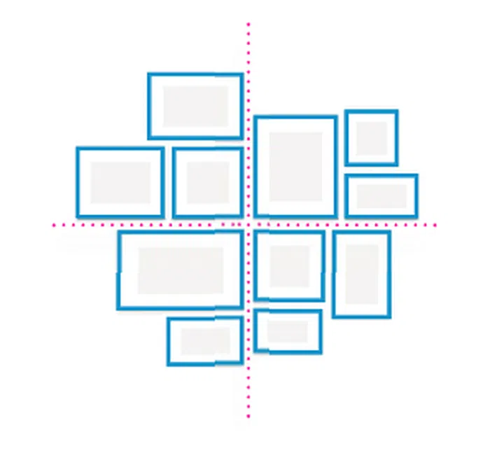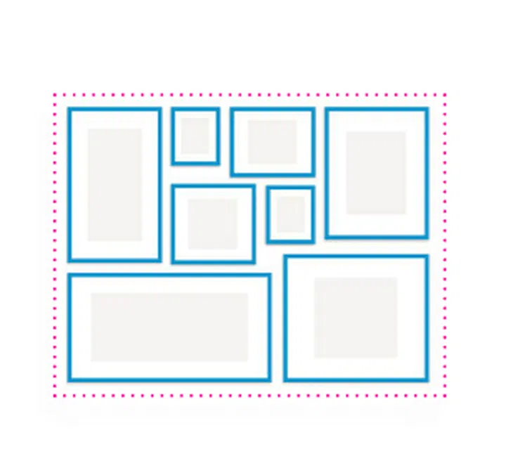 Usng many small pictures, make one big impression. Hung in a block, the images are arranged to come together into one large, harmonic whole. They are kept within the invisible boundaries of a clearly defined outer shape.