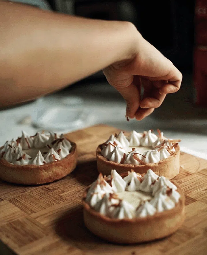“Natural lighting is always the best! Angles and backgrounds depend on the baker’s preferences. I tend to go for more minimalist presentations and warm tones. With cakes and other bakes, I prefer to keep it simple and focus on them,” says Levine Thio, founder of vegan-based home bakery Gratus, who works with a professional camera as well as her phone’s camera.