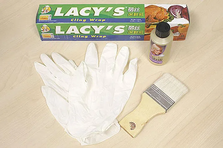And while you're at the handy man store, pick up a brush and some cling wrap too. The idea is to wrap the coated plastic parts, so that the cream peroxide doesn't dry up too fast. I've more tips towards the end of this article.