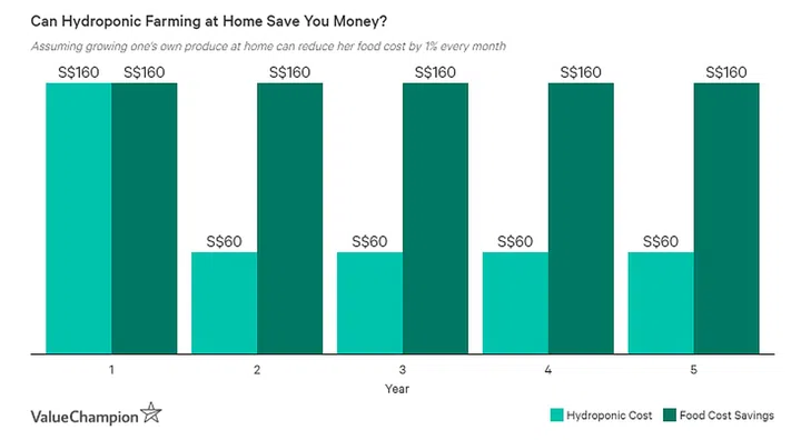 To sum out the previous section, it costs about $100 to set up a hydroponic kit and another $5/month to operate it to grow around 36 produces every 45 days. If you were to do this for 1 year, the total cost is approximately $160 for producing roughly 300 sets of vegetables and fruits. To assess whether this is a financially good move, we can compare this cost to how much it could help consumers save on what they spend on groceries. According to the government's survey, an average household spends about $1,334 per month on food and beverage. Even if growing your own veggies could reduce a family's food budget by around 1%, the reduction in grocery bill can help pay for the whole system within the first year, with additional $100 in savings in each of the subsequent years.