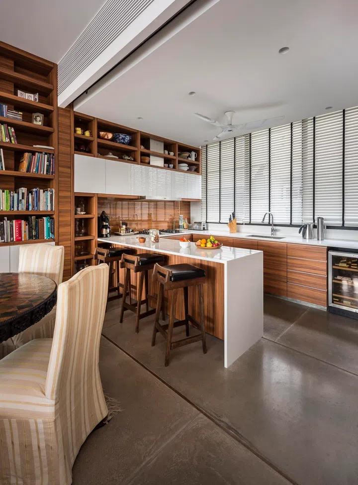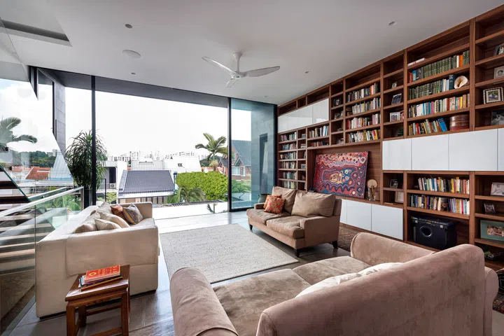 “We treated the air-conditioning not as a constraint but as a design opportunity, concealing supply and return within a full-length linear grille that reads as a deliberate architectural element. In Singapore’s humid climate, the timber lattice also helps mitigate condensation, as it does not chill as readily as metal and diffuses airflow to avoid cold spots. The result is a seamless integration of performance and design,” explains Lawrence Puah, Director, akiHAUS.