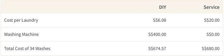 Also, there's another way of looking at this cost comparison. What if you were not to buy a laundry machine at all and always rely on a third-party to wash your clothes? At $20 per laundry service, you could do 34 laundries (or 8.5 months x 4 times per month) before the total cost of using third party service exceeds the total cost of buying a laundry machines and doing it yourself.