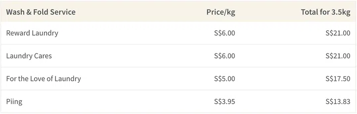 In comparison, most laundry service providers charge around $4 to $6 per kg for wash & fold service. This would imply that you could be spending around at least $20 on your laundry including delivery (most places offer free delivery for orders above $50).