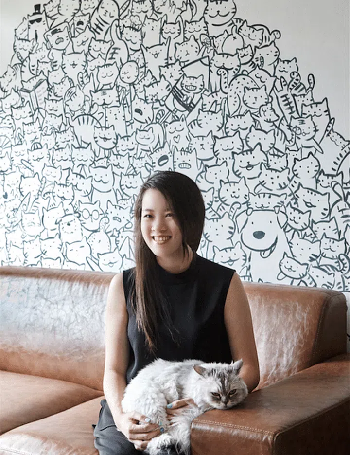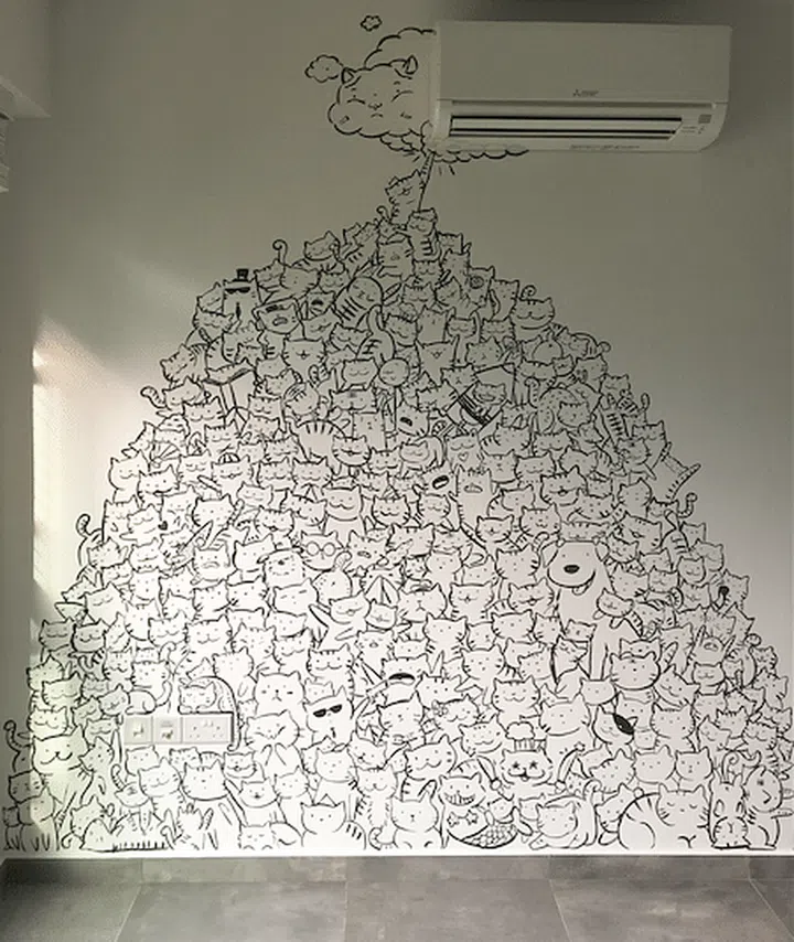 Her debut apartment mural is Meowtain, a cat-inspired piece done in a four-room HDB BTO home in Punggol, which she completed in December 2016.
