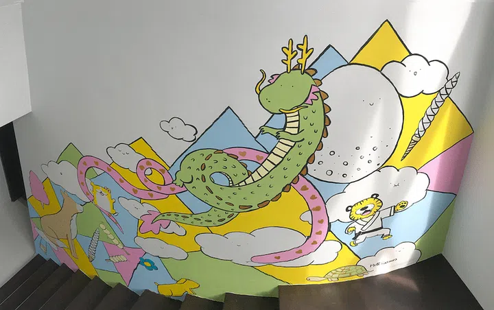 One of her most colourful wall murals has animal drawings depicting the homeowners’ Chinese zodiac signs.