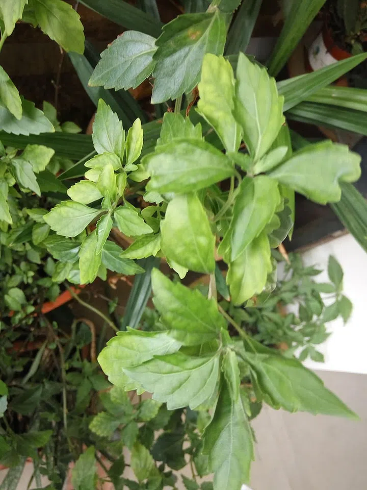 The smaller potted plant has leaves that are chlorotic - green veins against a lighter green background. This is a sign of nutrient deficiency.