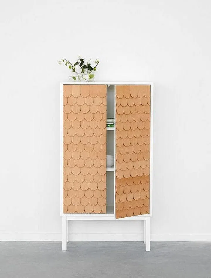 Wooden scales remind one of a traditional roof structure, but they become unique highlights when used on the door panels of this shelf from A2designers.