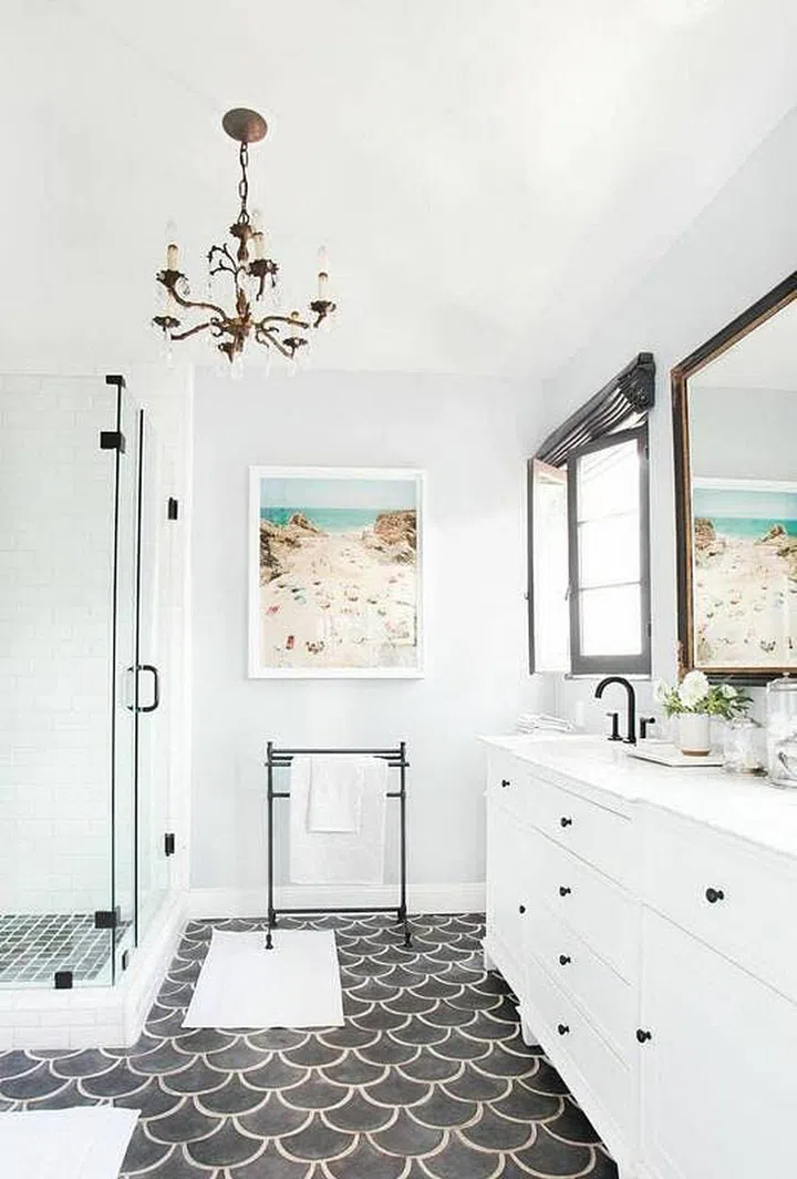 Emily Henderson uses scales in her bathroom to break up the solid colours, creating a nice visual contrast to the straight lines.