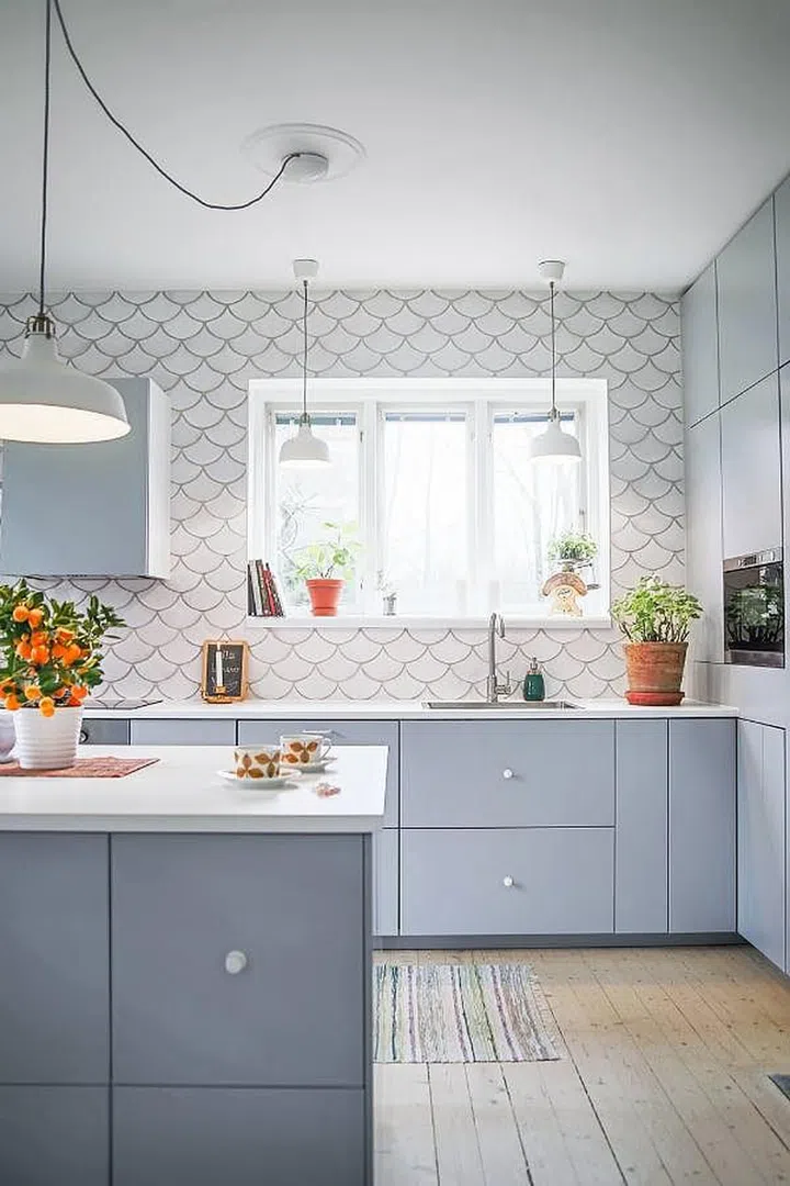 This wall accent look from Digsdigs shows how even plain-coloured scale tiles can make a kitchen look warmer and more inviting.