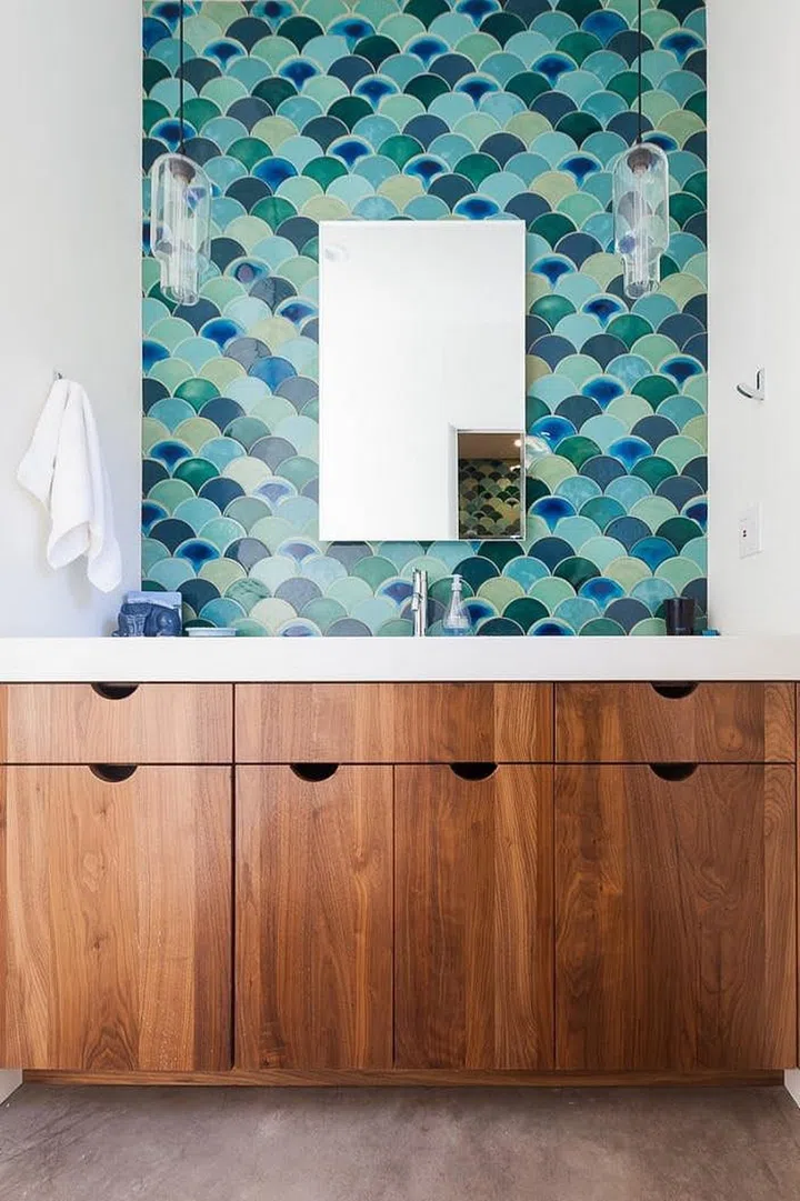 This interesting accent wall in the bathroom seen in Homepolish helps to bring in natural shades of blues and greens into the space, creating a serene and calming effect.