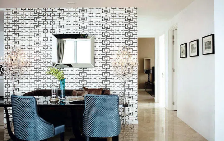 Pull together a more complete look for your living room by mirroring the dining chairs’ upholstery with the motifs on the feature wall!