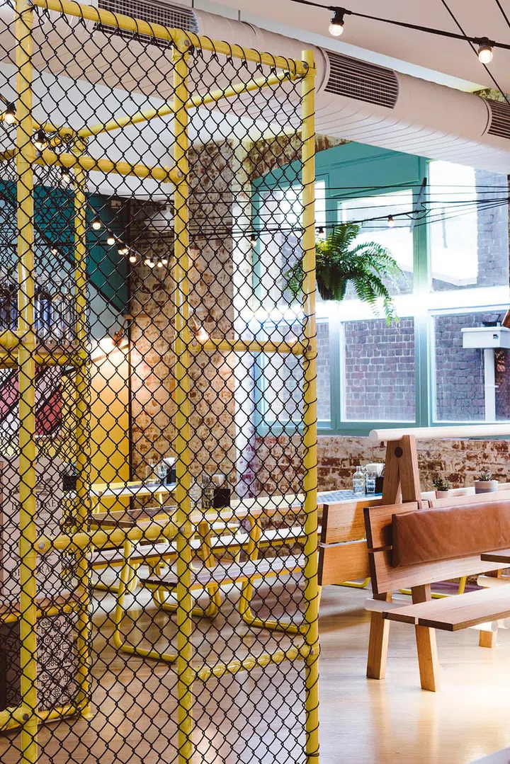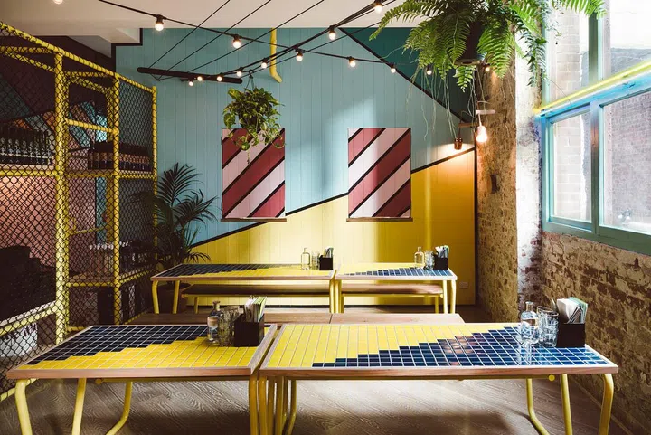 Mexican interior is known for its use of bold colours that oozes a warm and welcoming ambience, such as red, purple, and orange. Fonda chose to express this with a modern twist, sticking to simple furniture painted in cooler shades - though no less colourful. It seems that yellow and baby blue tie the theme together!