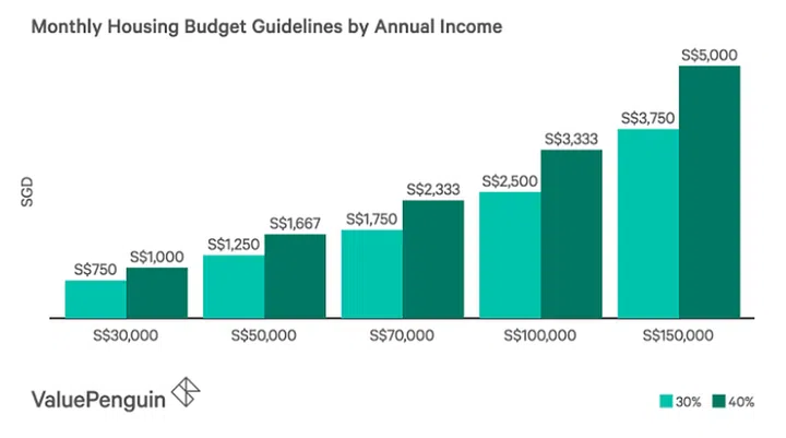 Experts typically suggest that you should spend no more than 30% to 40% of your gross monthly income on housing. These limits are designed to allow room for expenses for basic necessities such as food, transportation, health care and personal savings. It is important to note that these suggested housing budgets include rent and mortgage payments, as well as other related housing costs such as utilities, maintenance or homeowners insurance. For an individual earning S$50,000 annually, this translates to S$1,250 to S$1,667 per month for housing costs.