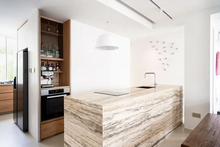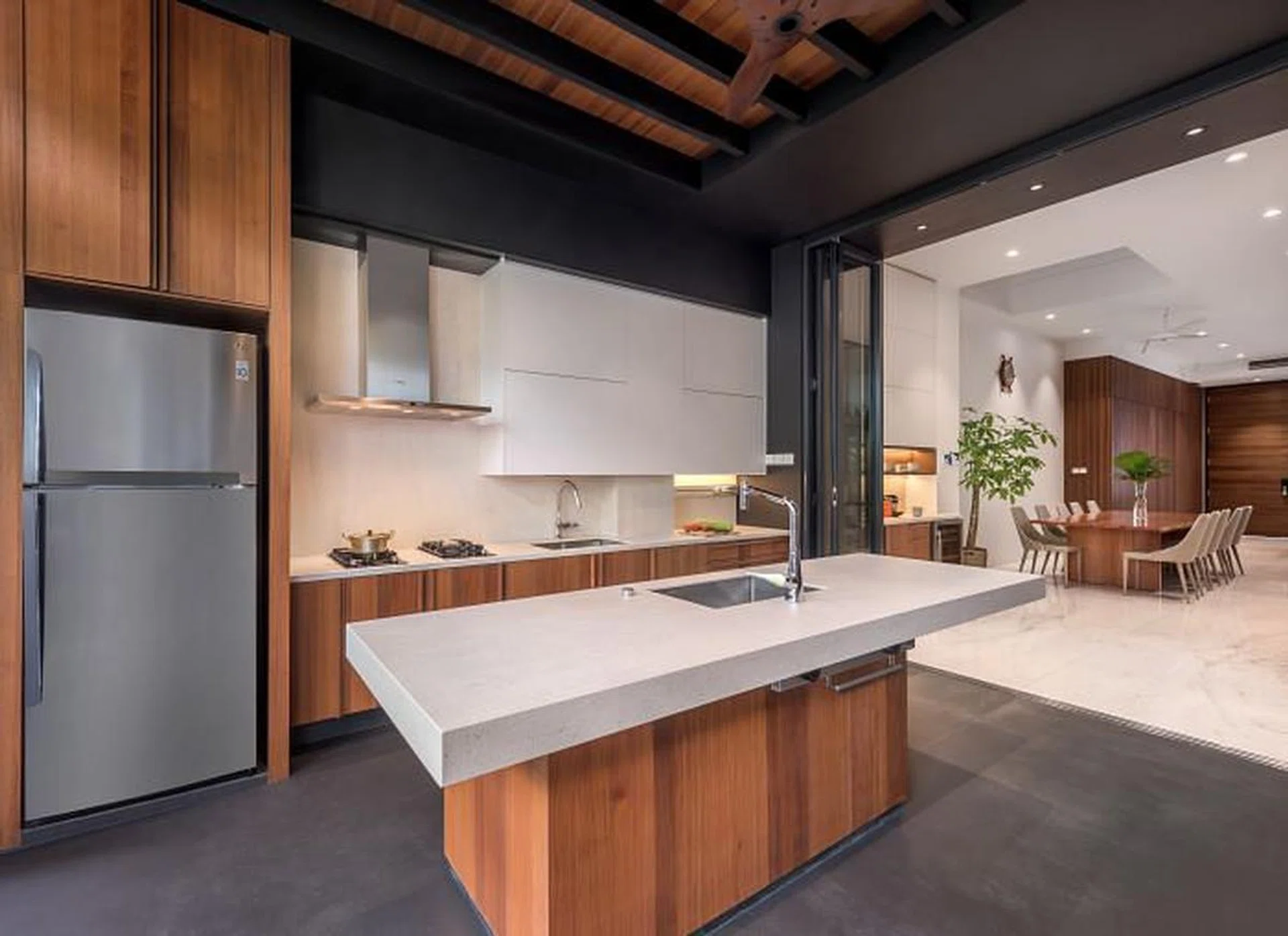 As the clients are in the precast concrete business, there was a synergy between the design team and the homeowners in terms of exploring different construction techniques and materials that could be applied to each of the spaces. The use of large format stones and tiles in areas, such as the living room, kitchen and bathrooms, achieve a continuous flow, with special consideration paid to the joints and the grains.