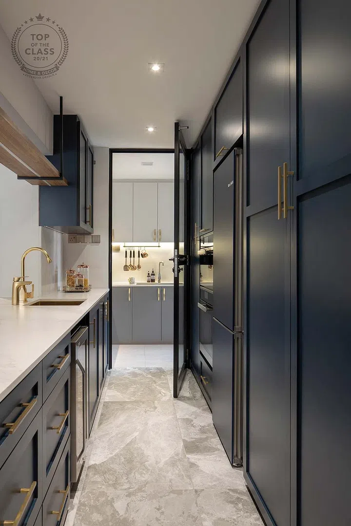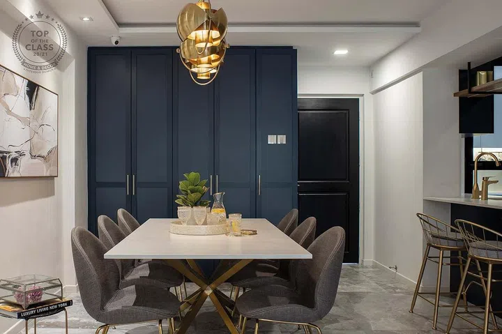 The kitchen cabinets echo a similar design. Clad in a deep blue, these statement panels, along with the brass accents from the handles, evoke a restaurant or art gallery feel that is a blend of classic and contemporary. By cleverly combining premium materials and pieces with Taobao finds, the designers managed to achieve a classy and elegant look.