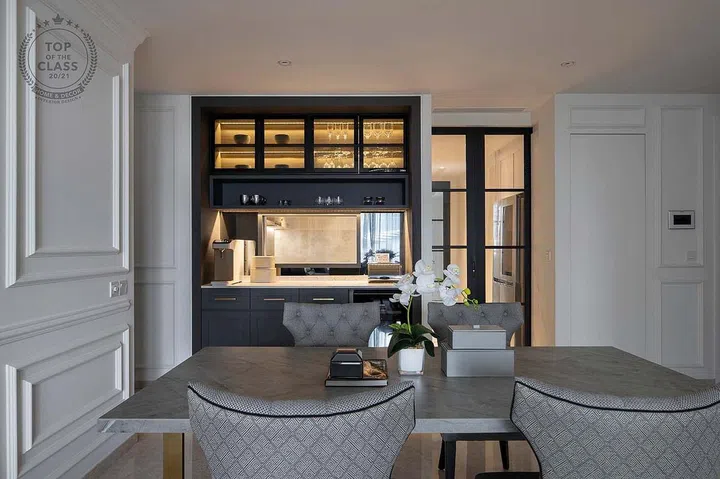 This French-inspired apartment is home to TS Wong of MOW Interior. Designed with input from his wife, business partner and co-founder Shermaine Ong, the needs of their large family were top priority. The spaces are flexible enough to comfortably accommodate everyone. With storage an important consideration, built-in cabinets along the walls provide plenty of storage while clutter is discreetly concealed behind a series of continuous panelling with French mouldings.