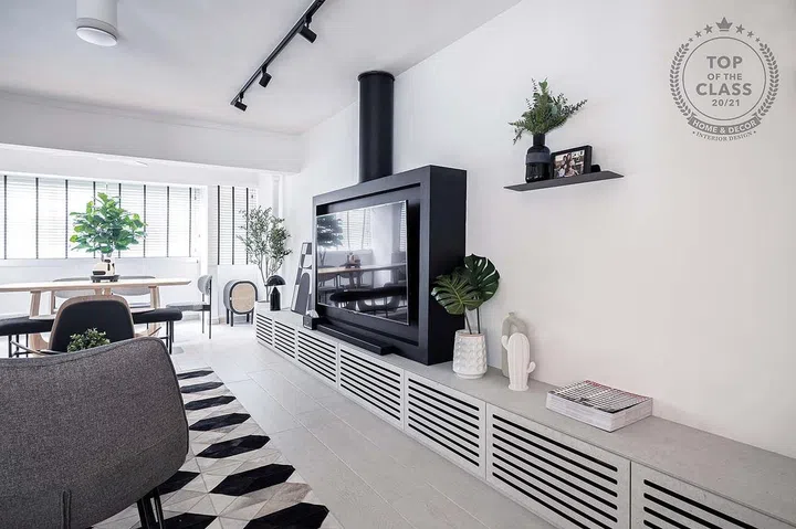 While this home can be categorised as being of Nordic influence, Wolf Woof's Carmen Tang was determined to not let it turn into just another Scandi-style home. Instead, she adopted a light-hearted approach to its design. A series of built-in cabinets with handles comprising wooden birds peeking out of a hedge injects an element of fun to the living room as does the feature wall with its old-school TV frame with antennas that houses a flatscreen TV.