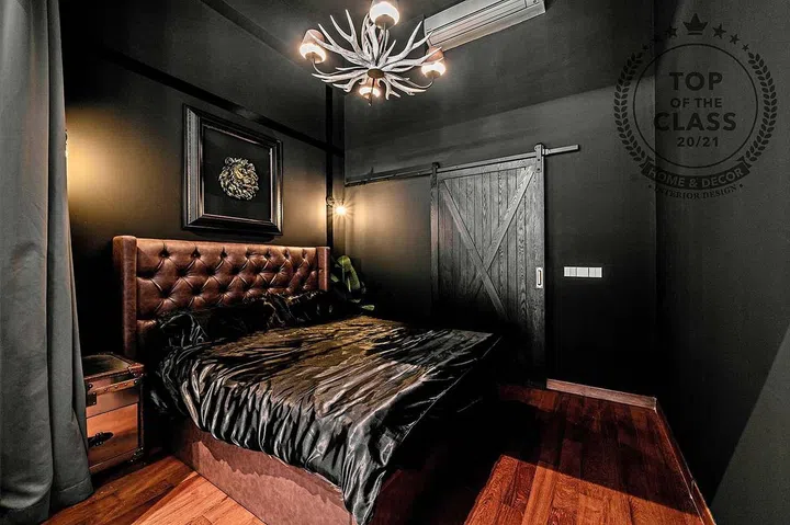 Inspired by the vibes of Regent Singapore's Manhattan bar, the client wanted to create a personal gentleman’s club-style loft bar in his new home. The predominantly black interior with brass and gold accents as well as a touch of vintage brown set the tone for an elegant, masculine environment. Access to his bar is via a spiral staircase between the living room and kitchen, giving the cosy space an air of exclusivity and mystery. Unique fixtures, furniture and ornamental pieces – including a knight's full suit of armour by the staircase, a framed lion's head, a driftwood pendant lamp above the master bed as well as a custom-made barn door to the master bedroom with the same black laminate as the rest of the interior – add to the overall gentleman’s club vibe.