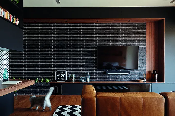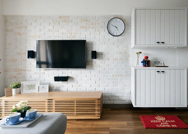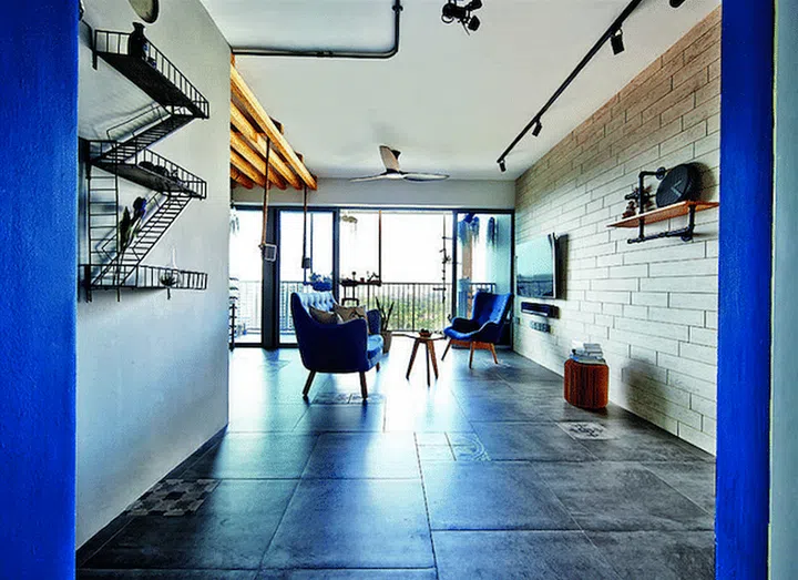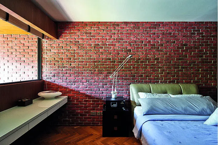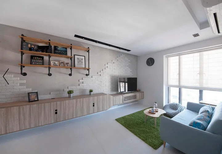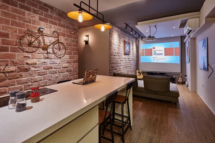 The brick-lookalike wall in this five-room DBSS apartment goes well with the concrete-look and patterned tiles.