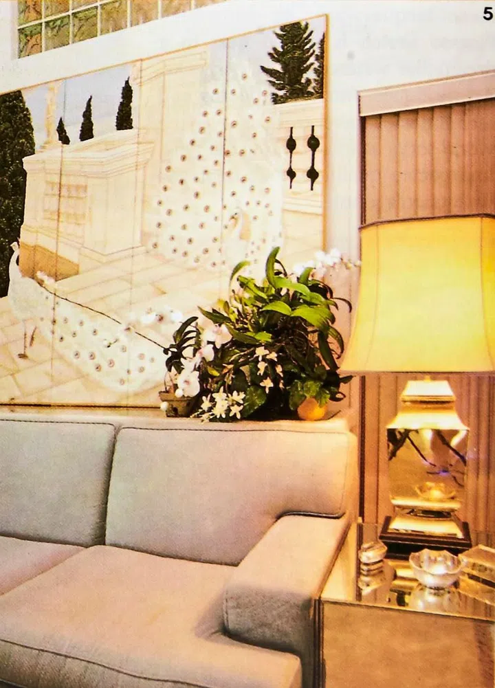 A graceful tablescape of exotic white orchids echoes the eyes of the peacocks’ tails in the painting. Like a lot of the plants and flowers in the house, real and fake were blended to achieve a highly stylised ‘blooming’ that is rare in nature. All fake plants from Tree Creations at Forum Galleria.