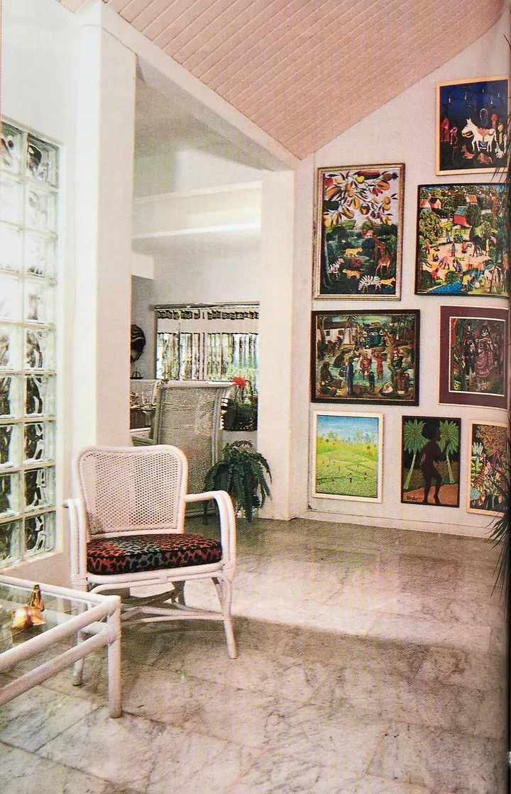 Instant impact: On entering the house, the eye is immediately engaged by a soaring art gallery (once a picture window) of vibrant, colourful paintings at the end of the foyer. Mr Chollet once paid a short visit to Haiti, and came back laden with this collection of 13 “Native” or primitive paintings of Voodoo, pastoral and native market scenes.