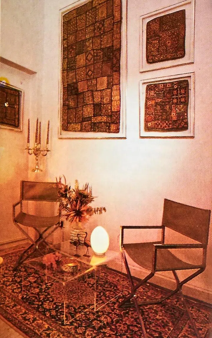 A collection of antique mirror-embroidered Rajasthani textiles hangs above a carefully-edited arrangement with a translucent theme – the lucite table holds an egg-shaped lamp, brass and pink jade cranes from Mauritius (also egg-shaped) and pink jade grapes.
