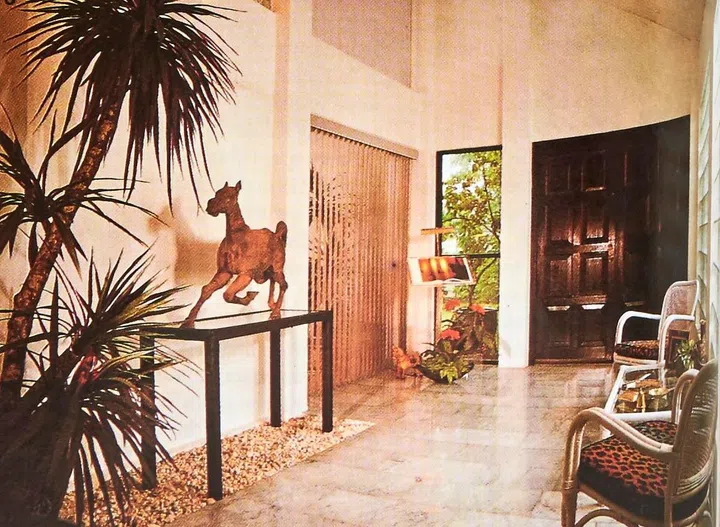 “I hate houses where you step through the doorway right into the living room. It’s too abrupt,” declares the designer. So a sense of arrival was created by closing off two superfluous openings in the wall with plywood and vertical blinds. The ‘wall’ created now backdrops a lively old Indian carving of a running horse and en elegant brass book stand.