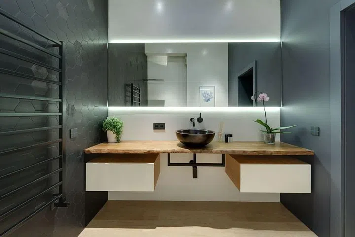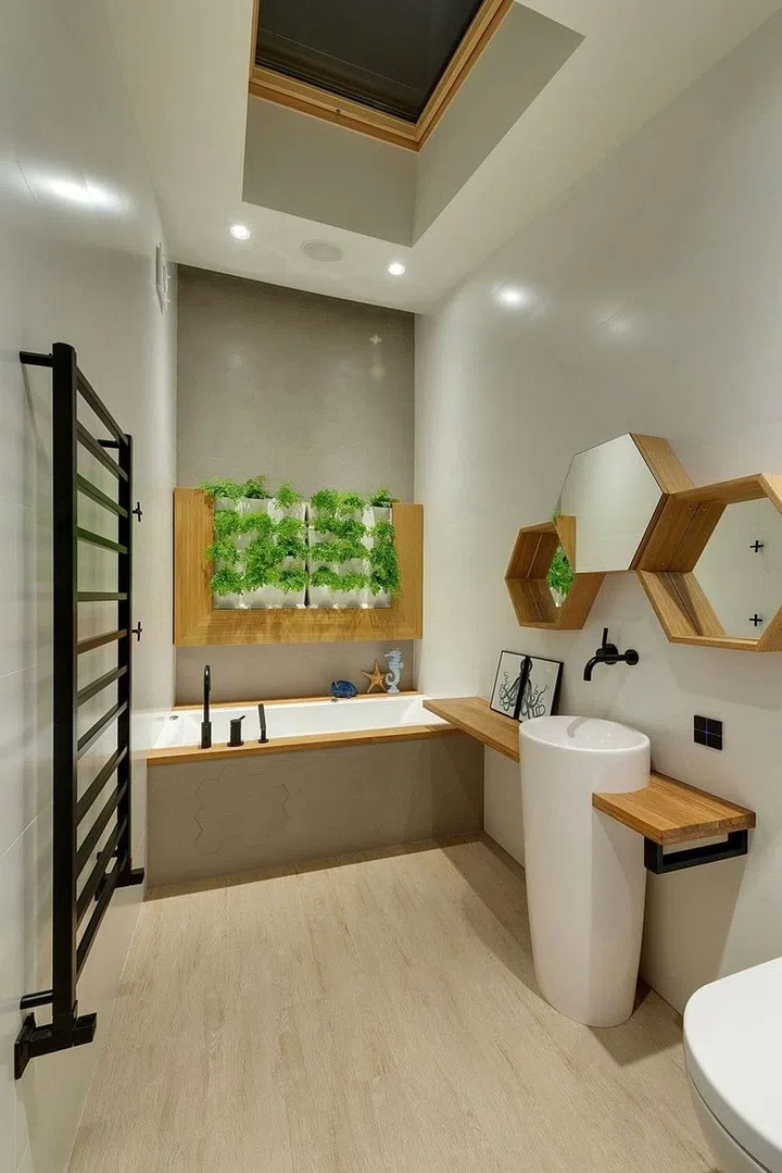 Hexagonal mirrors enhance the subtle geometry of the bathroom's built-in structures.