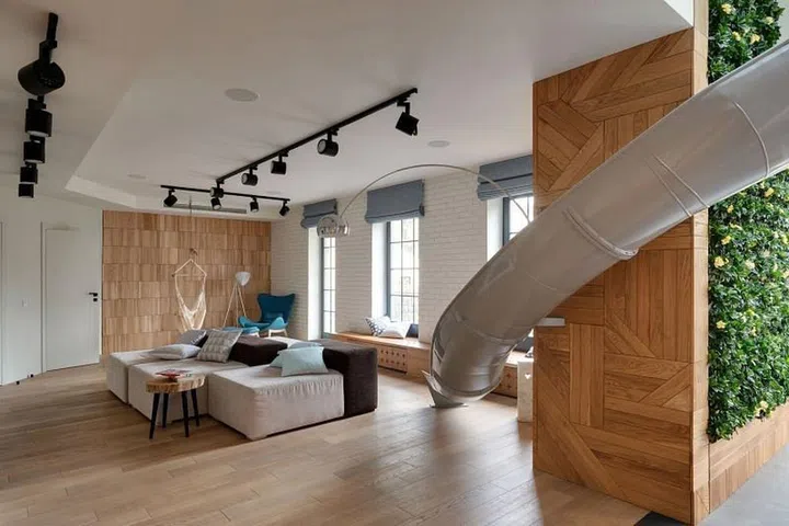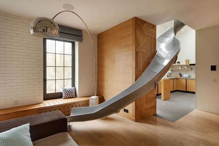 The winding steel grey slide connects two floors in this home. It adds an element of surprise and fun, and complements the abstract lines of the minimalist apartment.
