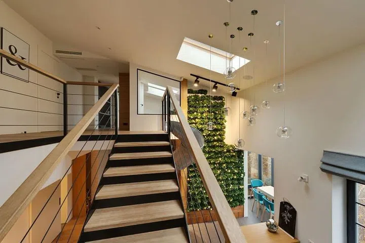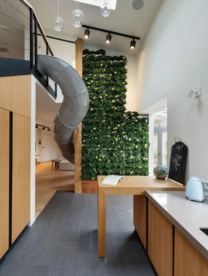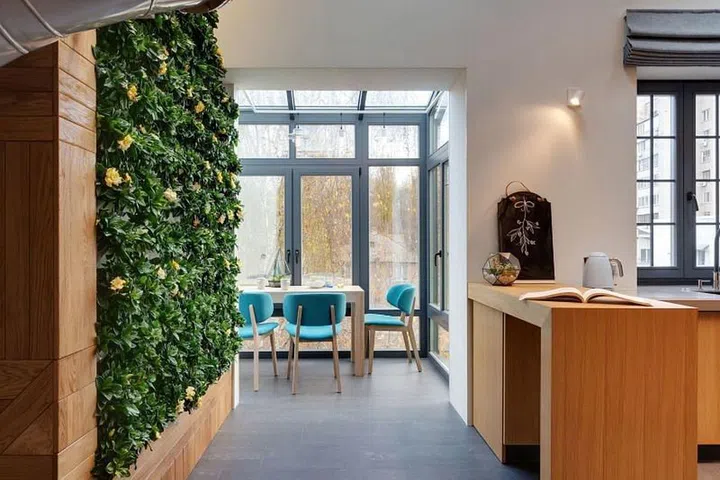 A floor-to-ceiling green wall separates the living area from the open kitchen.