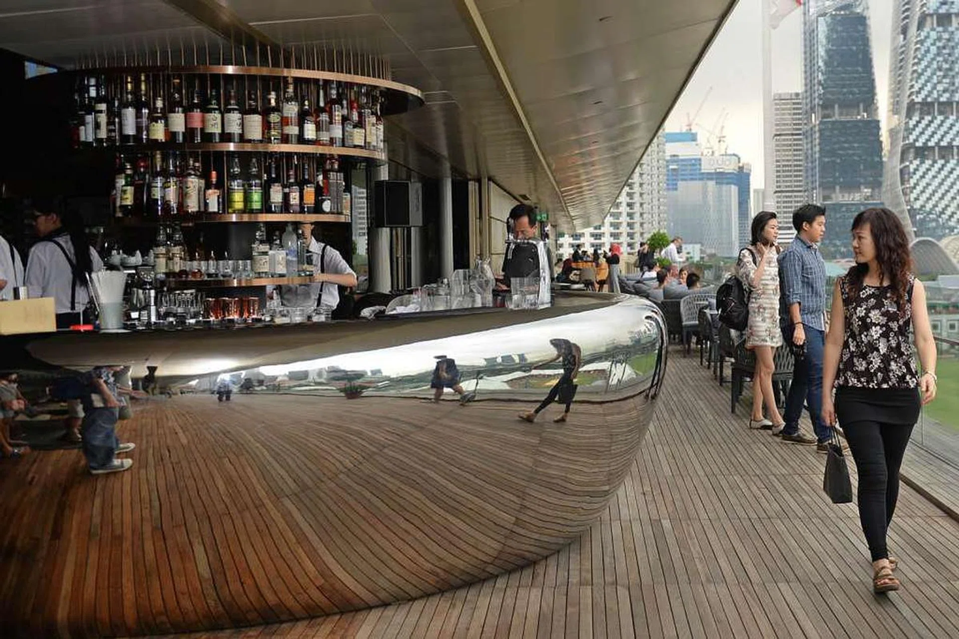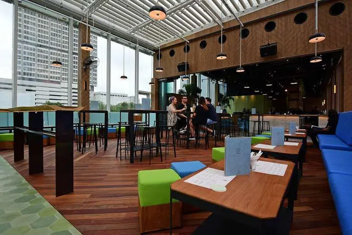 The spacious rooftop terrace bar, located in the Suntec City Sky Garden, opens on Thursday 18 Feb. Decorated in earth tones, pastel blues and greens and tiled and wood finishes, the breezy 353 sq m space is owned by Limited Edition Concepts, which also runs basement club Kyo in Cecil Street and hip-hop club Refuge in Circular Road. Hanging plants adorn the shelves behind the bar counter and there is ample seating and standing space with high tables, lounge seats and bar seats. The wooden bartop counters were sourced from Semarang in Indonesia.