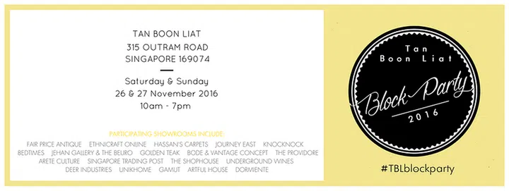 Join Tan Boon Liat’s first ever block party this weekend with over 20 partipating showrooms such as Deer Industries and Arete Culture. The two-day party will have design workshops, food and wine tastings, seasonal gift ideas, silent auctions, special offers and savings, collection launches and over $5,000 worth of prizes for you to win!
