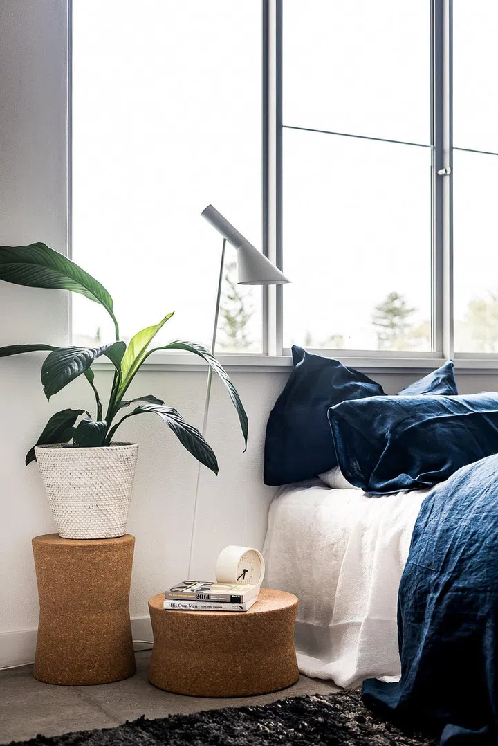 Natural materials like cork and linen help imbue a relaxed atmosphere. Side tables in different sizes also create some visual interest in the space.